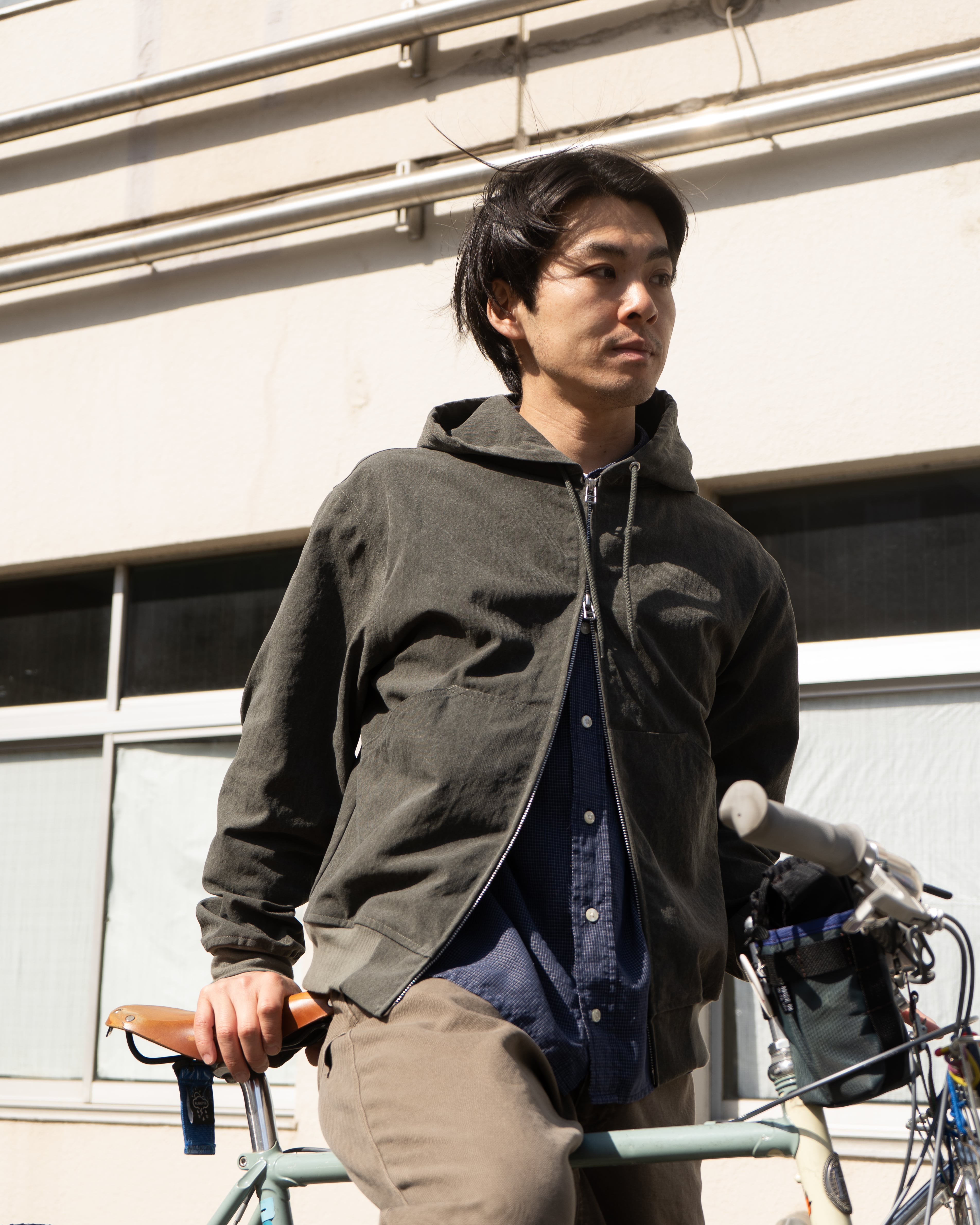 下側だけを開けて八の字のように着てあげると、自転車に乗る時などアクティブに動く際にも快適です。
